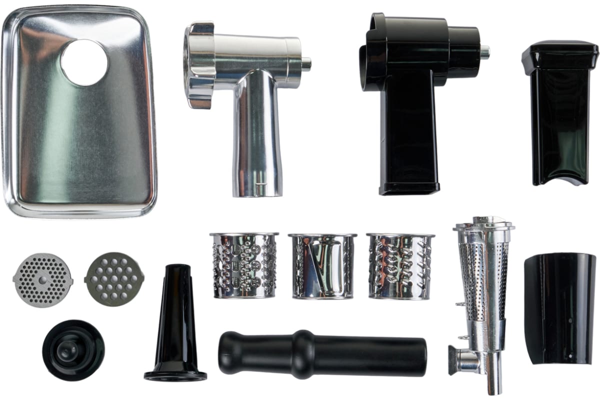 Три перфорированных диска позволяют сделать фарш разного помола, благодаря отверстиям разного диаметра. А с помощью дополнительных насадок можно сделать домашние колбаски и кеббе. Модель MG-TK3 выделяется наличием функций овощерезки и соковыжималки.