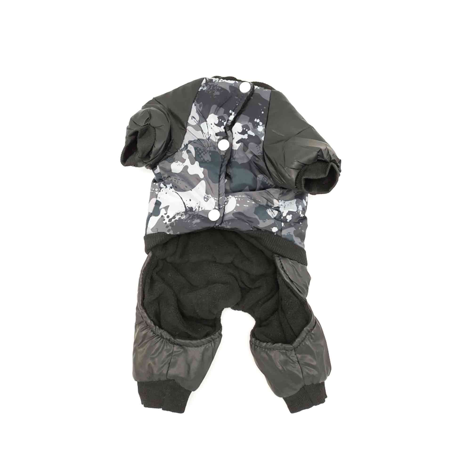 Ткань плотная, защищает от холода, грязи и влаги, сохраняя тепло. Костюм для животных фиксируется кнопками снизу. Модель обладает продуманным кроем, обеспечивающим безупречную свободу движений собаки.