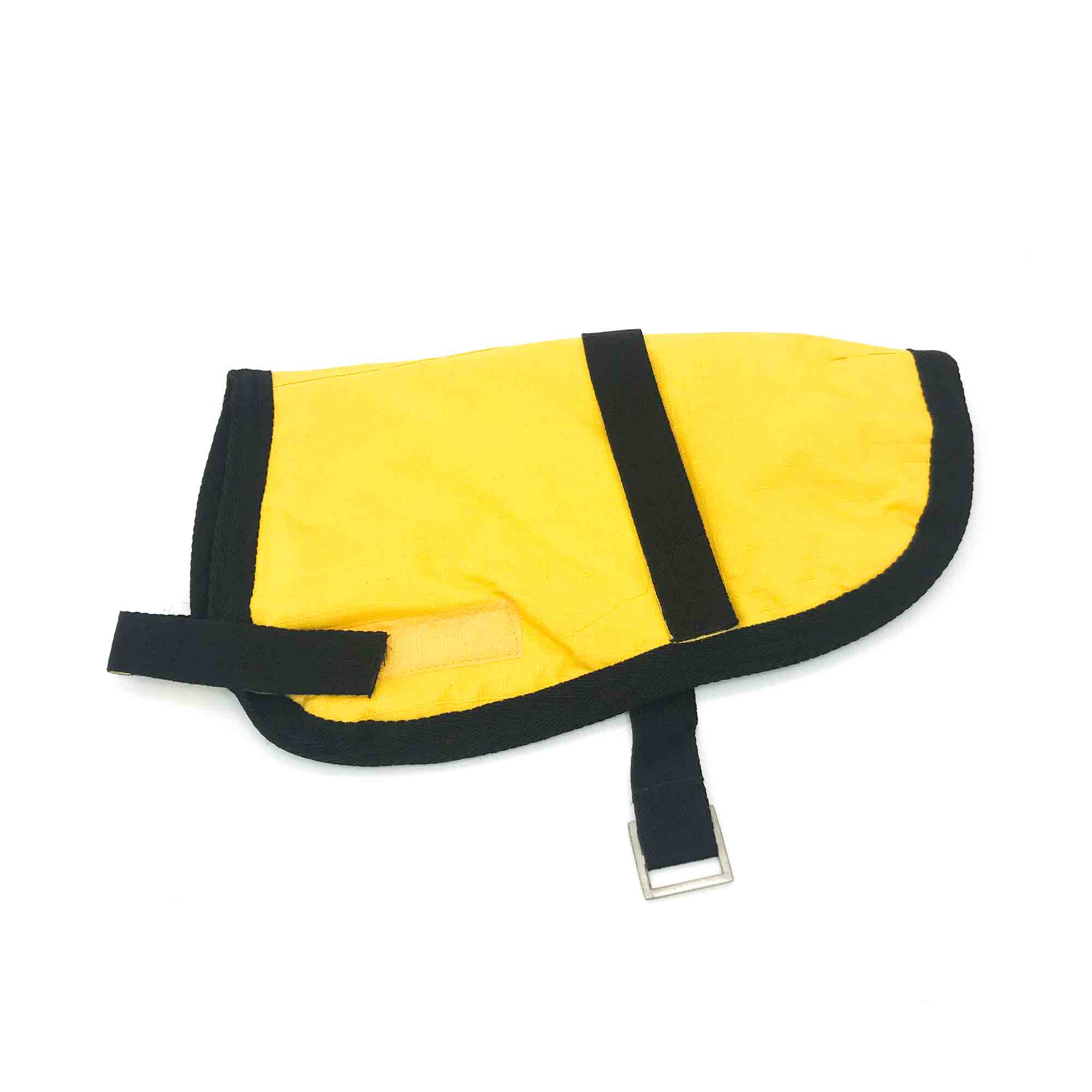 Попона эргономично одевается на тело собаки, крепится надежно с помощью широкой липучки под шеей и с помощью крепления защелки-фастекс под грудью собаки.