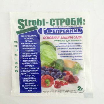 Действующее вещество препарата Строби: Крезоксим-метил 500 г/кг, водно-диспергируемые гранулы, хорошо растворимые в воде. Препарат подавляет процессы дыхания у грибных клеток.