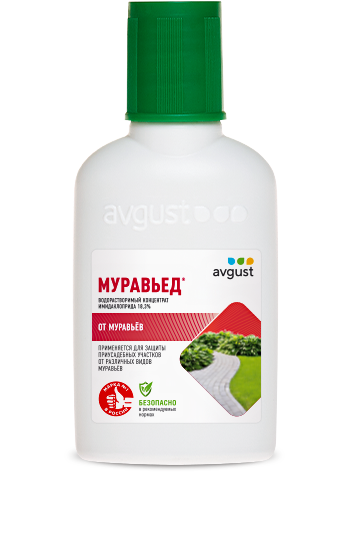 «Муравьед» — препарат контактно-кишечного действия. Применяется на приусадебных участках, отмостках домов, в щелях между садовыми плитами. Он попадает в организм насекомых, оказывая губительное влияние на их нервную систему: вызывает торможение мышечной деятельности, судороги, а затем полный паралич. Положительные особенности препарата — отсутствие привыкания к нему муравьев и экономичный расход. Муравьи исчезают в течение не более трех суток после обработки. Защитный эффект сохраняется на протяжении не менее 3 недель.