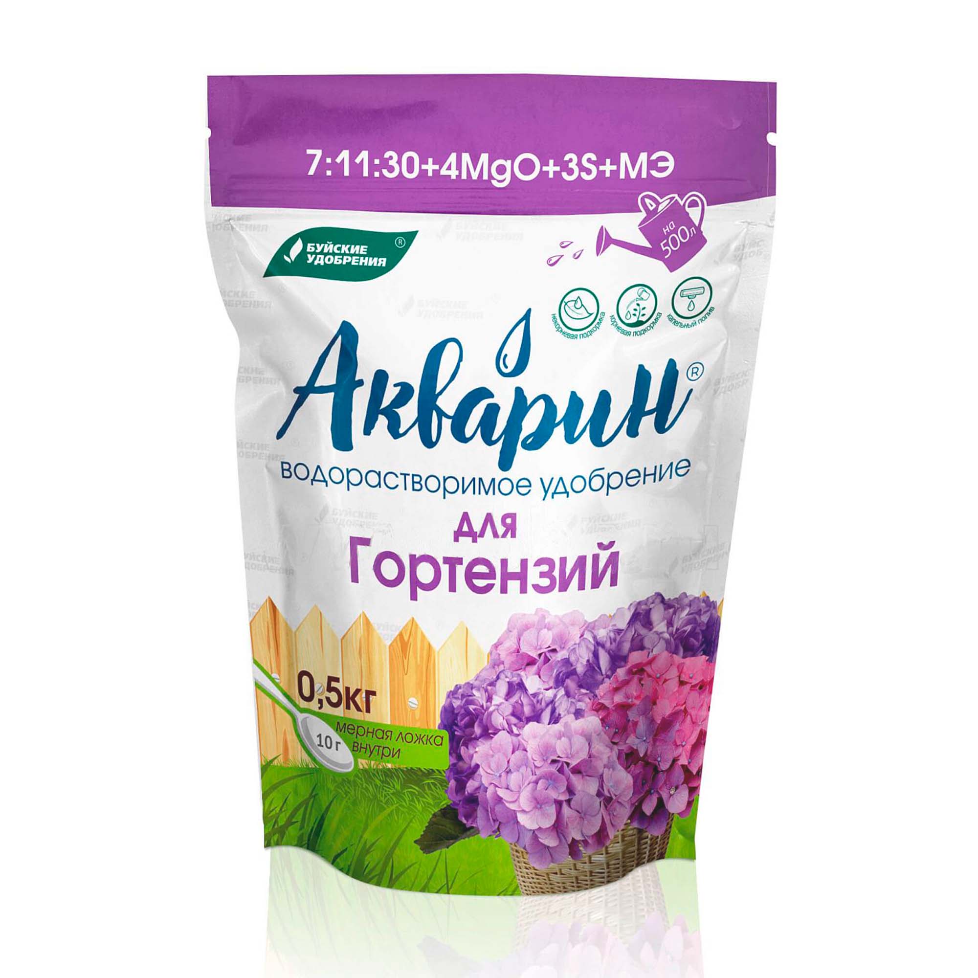 "Акварин" для гортензий - водорастворимое удобрение, в состав которого входит азот, фосфор, калий, магний, сера и микроэлементы – железо, цинк, марганец, медь в хелатной форме, а бор и молибден – в минеральной.