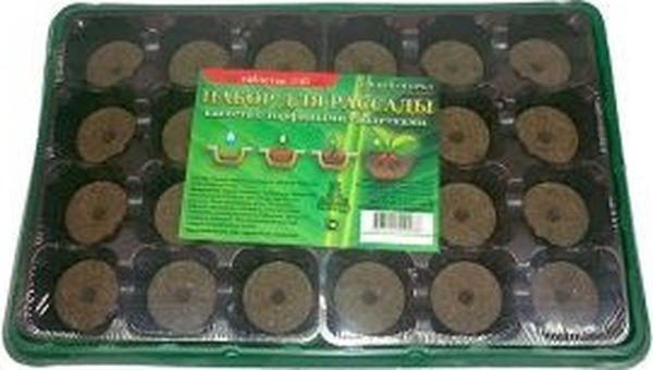 Торфяная таблетка. Имеет размер 0,41х0,41х0,07 см. Содержит прессованный торф и включает в себя все необходимые микроэлементы и питательные вещества.